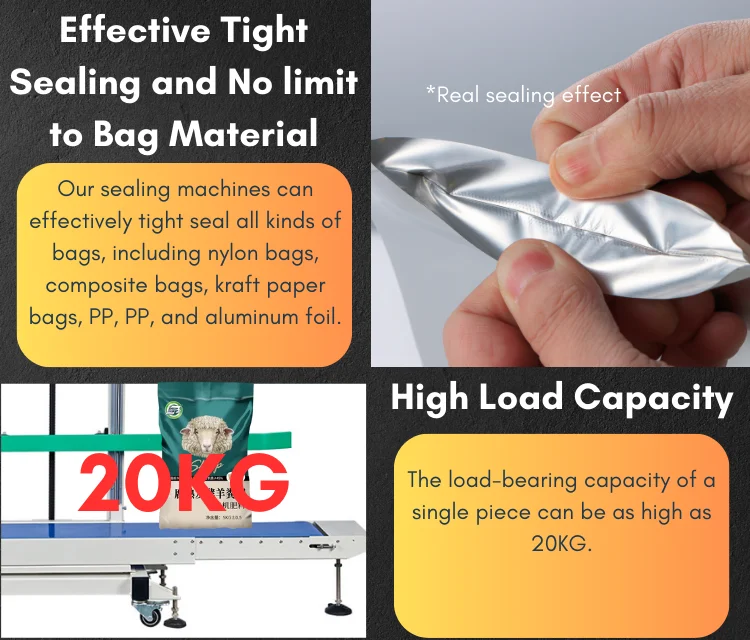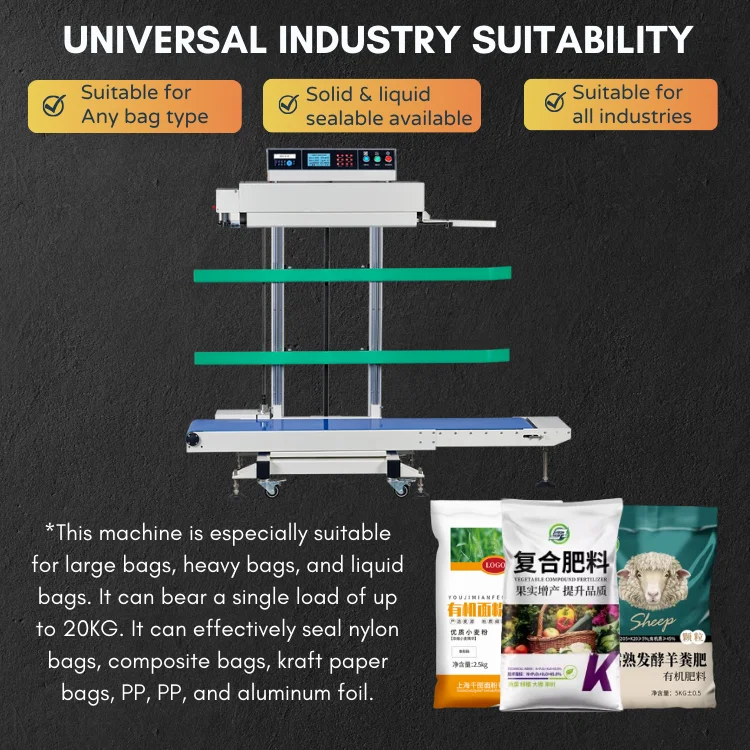 Seal Bag Type | This machine is appropriate for heat-sealing plastic bags that require sealing. Particularly suitable for sealing large and heavy (20KG)as well as liquid bags. | ||||