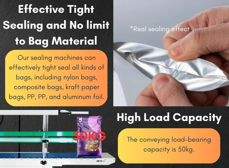 Seal Bag Type | This machine is appropriate for heat-sealing plastic bags that require sealing. Particularly suitable for sealing large and heavy (50KG) bags as well as liquid bags. | ||||