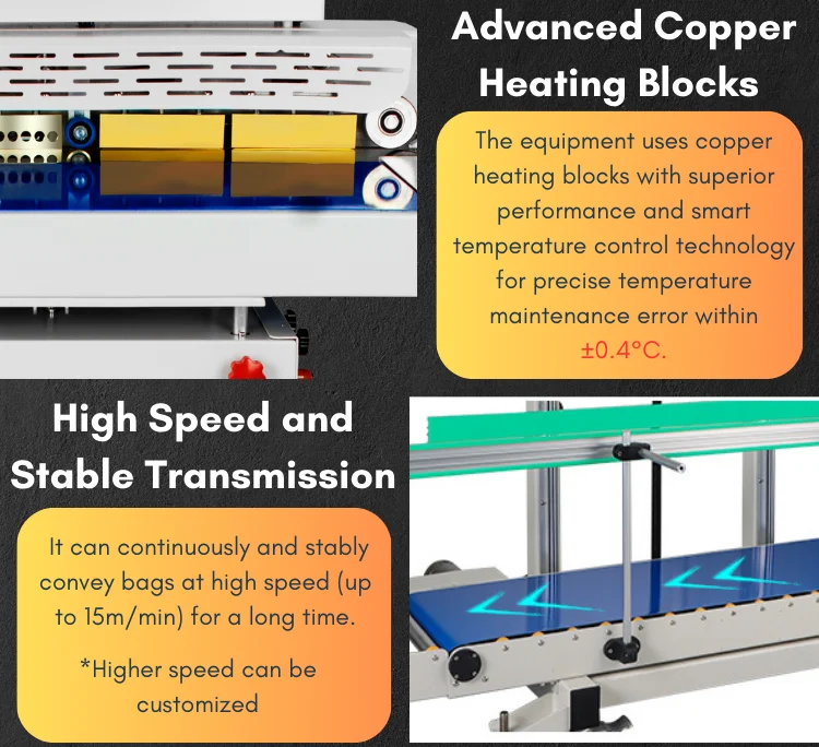 Sealing speed | 0-15m/min(Customizable) | Adjustable sealing range | 100-950mm(Height) | ||