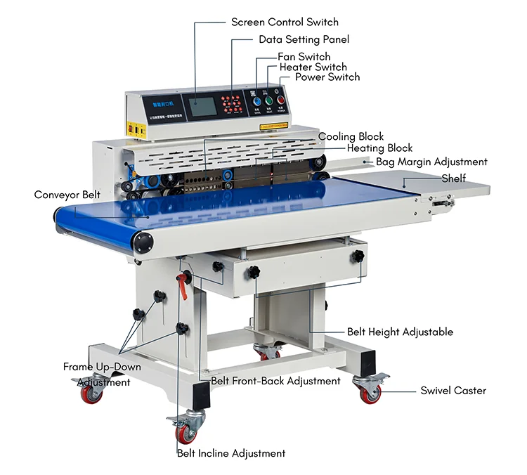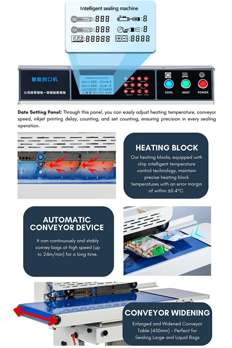 Sealing speed | 0-24m/min | Conveyor Table Height From The Ground | 700-900(Adjustable) | ||